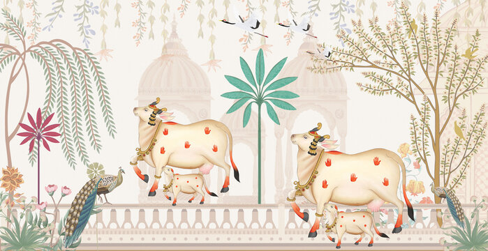 Lord Krishna with Cow Painting, Hindu God, Spirituality, Religion, Divinity, Peacock Feather, Landscape, Nature, Bliss.