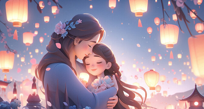 Weaver girl and cowherd together. Love and romance concept. Tanabata or Qixi Festival. Chinese Valentine’s day. Illustration for greeting card, banner, poster with copy space