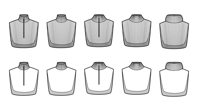 Set of Add-on Knit Collars detachable accessories with zipper fastening Turtleneck Sweater technical fashion illustration. Flat jumper apparel front white grey color style. Women men unisex CAD mockup
