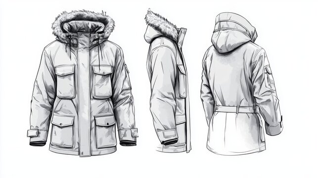 Technical flat sketch of an oversized anorak hoodie featuring a half-zip neckline and large front kangaroo pocket