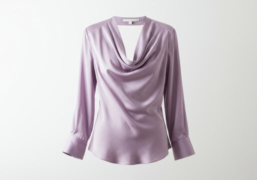 A mauve, satin blouse with a cowl neckline and long sleeves is displayed against a plain background.