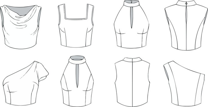Assorted Sleeveless Top Vector Set, Fashion Flat Illustration, Cowl Neck, Square Neck, Halter Neck, One-Shoulder, High Neck, Bodice Technical Drawing Bundle