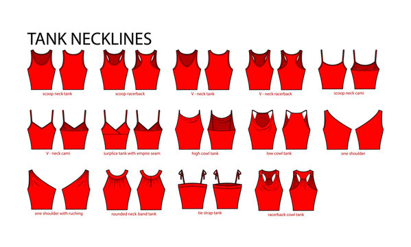 Set of necklines tank clothes - tops, cami, one shoulder, scoop, racerback, V-neck, cowl technical fashion illustration. Flat apparel template front, back sides. Women, men unisex CAD mockup