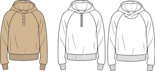 Hooded sweatshirt CAD sketch, front view with button, zipper, crossover neckline styles, raglan sleeves, ribbed cuffs and hem band