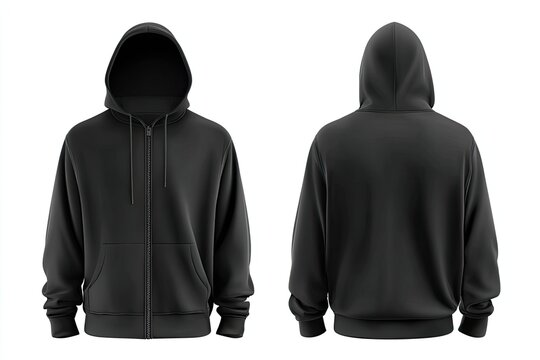 Front and back view of a black zip-up hoodie.  Blank, mock-up design, isolated on white background.  Features a hooded neckline and zipper closure