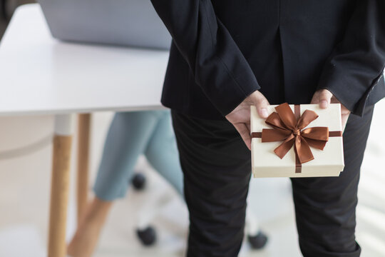 young manager prepared gift box to give to the beautiful secretary in the office to express the love and friendship they had shared between working together for long time. Friendship and love concept