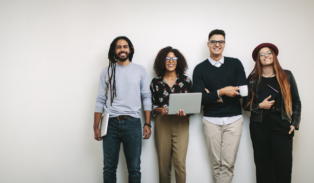 Confident coworkers collaborate in a modern office, discussing project solutions and analyzing statistics.