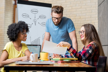 Group of coworkers sitting at the wooden table and working together on new startup project in modern loft office.Horizontal.Blurred background.Cropped.