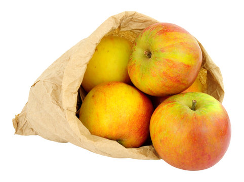 Fresh apples in an environmentally friendly brown paper bag isolated on a white background