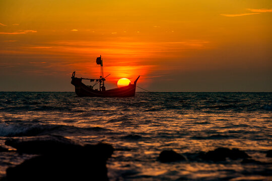 Scenic sunset seascape with beautiful traditional wooden fishing boat known as moon boat on beach, Cox's Bazar, Bangladesh