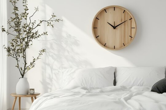 Scandinavian cozy ambiance in this bright bedroom featuring a wooden clock and acoustic panel on the wall