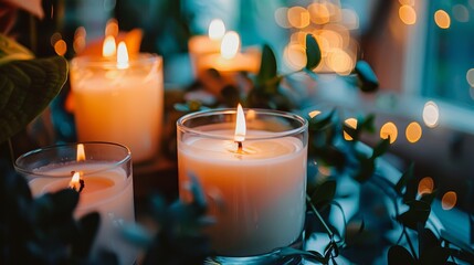 Blurry Christmas tree lights create a warm and cozy atmosphere in a softly illuminated interior with beige and white decor