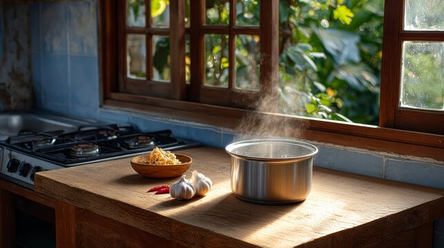 A pot of boiling water sits on a wooden countertop next to a bowl of garlic. The steam from the pot fills the kitchen, creating a cozy and inviting atmosphere