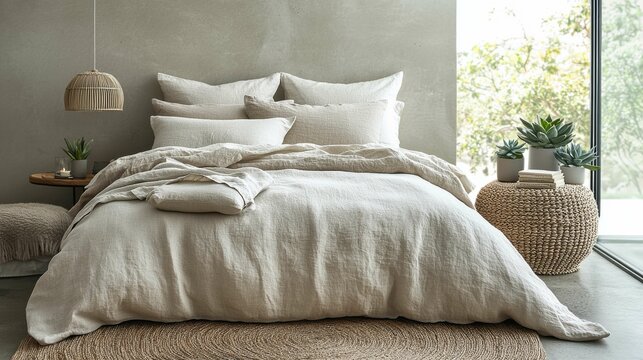 A serene bedroom featuring a soft bed with white linen bedding, a woven rug, and potted plants, emphasizing a calming, cozy atmosphere.