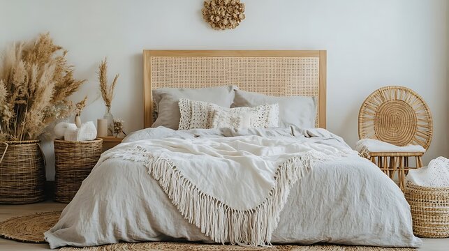 Minimalist Boho Bedroom Interior Design with Wicker Headboard and Woven Chair