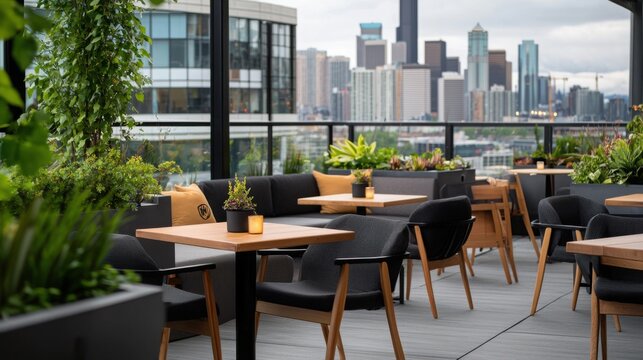 A stylish rooftop dining area featuring modern furniture, greenery, and a city skyline backdrop, perfect for relaxation and socializing.