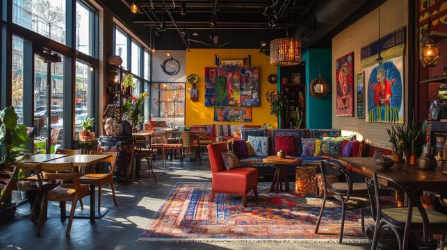 A vibrant bohemian cafe with eclectic furniture, colorful artwork, and a relaxed atmosphere, reflecting a creative and inviting environment.