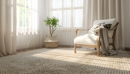 living room interior with cozy carpet white armchair and sheer