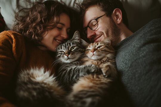 Two adorable cartoon cats peacefully sleeping together on a soft background, evoking comfort and warmth