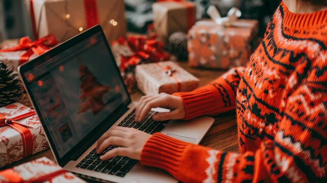 Holiday Shopping Online: Person in festive sweater types on laptop surrounded by wrapped gifts. Christmas shopping at home.