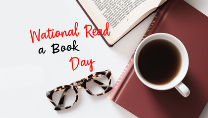 National Read a Book Day Celebration with Coffee, Glasses, and Open Book on Table.