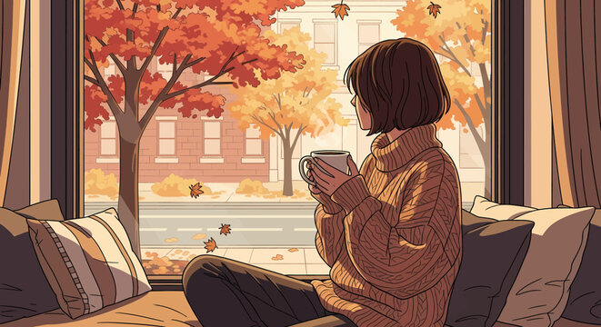 Cozy autumn scene A woman in a warm sweater sips hot coffee while enjoying the colorful fall foliage outside her window