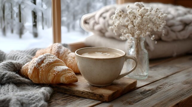 A cozy winter scene featu fresh croissants, a warm cup of coffee, and soft blankets next to a window overlooking a snowy landscape.