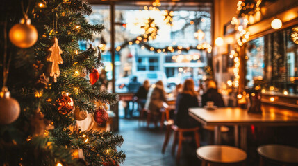 Blurry abstract view of a cozy coffee shop adorned with Christmas lights and decorations
