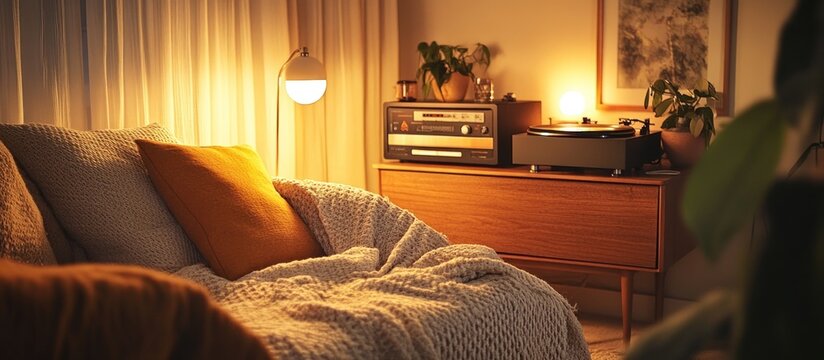 A cozy mid-century living room corner with vintage audio equipment and warm lighting