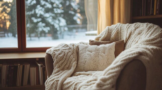 Cozy corner sofa with knitted blankets in Scandinavian living room bathed in light
