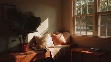 Sunlit window seat with pillows and plant interior design home decor and cozy corner reading nook inspiration