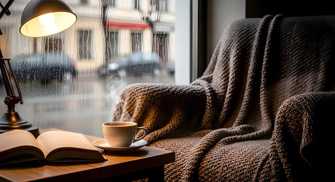 Cozy café corner with warm coffee cup, open book, soft blanket, and rainy window view, capturing nostalgic calm atmosphere with photorealistic textures.jpg
