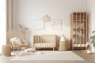 Mock up frame in children room, light cozy interior with wooden crib, 3D render