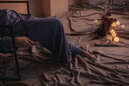 In the living room there is a close-up armchair with a blanket and a table with a cup of tea. A fireplace is burning near it. The concept of a country vintage vacation in the forest.