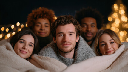 Diverse group of happy friend showing togetherness, feeling cozy and warm under one blanket. smiling people feel content and safe during peaceful winter night