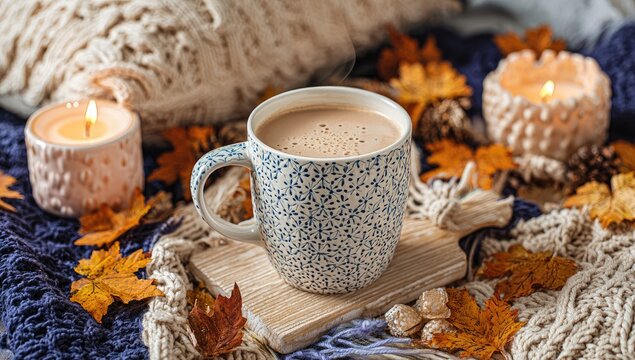 Cozy Hygge Bedroom Warm Knit Blanket, Candlelight, and Tea