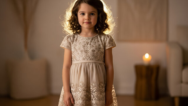 Girl wearing elegant embroidered birthday dress feeling sweet in a cozy indoor setting
