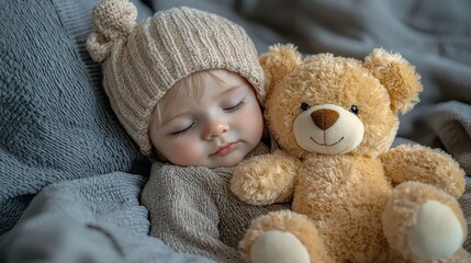 A child cuddling a fluffy teddy bear, feeling safe and cozy in a warm and peaceful bedroom.