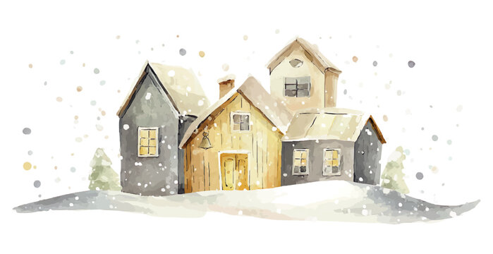 winter village watercolor illustration with snow falling, vector template for winter and christmas greeting cards or real estate advertising, cozy cream and grey colours isolated on white background