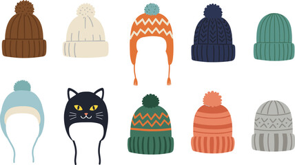 Colorful winter accessories collection featuring cozy hats and mittens in flat style, warm seasonal apparel illustration perfect for fashion