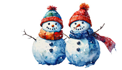 Snowmen wearing Santa hats stand cheerfully among decorated trees on a snowy winter evening