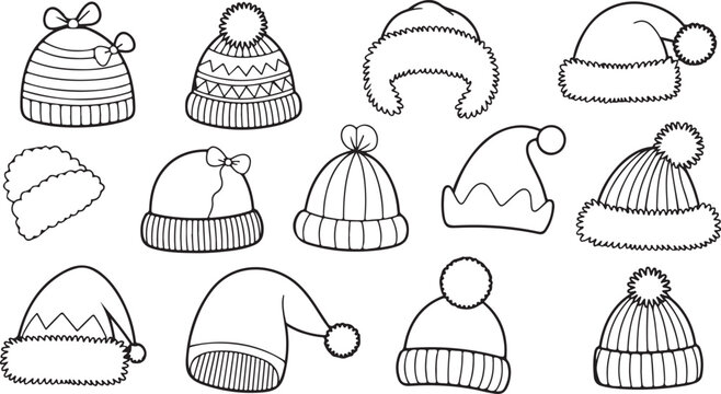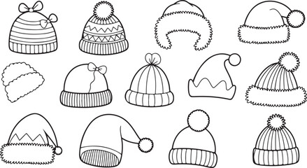Knitted winter hats with pom-poms, ribbed fold-over brims, textured fabric comparison, cozy cold-weather accessories, fashion flat vector illustration