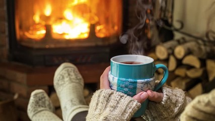 Cozy holiday scene relaxing by fireplace