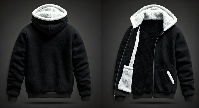 A cozy black fleece jacket with a soft white sherpa lining perfect for warmth and comfort ideal for casual wear in cold weather.