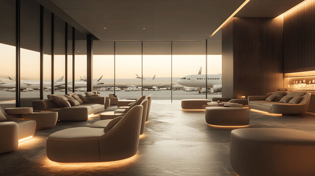 spacious office lounge with large windows, cozy and comfortable armchairs, green and natural plants in modern coworking environment, workspace organization concept