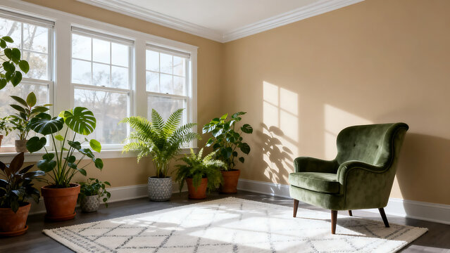 Cozy and minimalist modern living room interior design with a comfortable mid-century modern armchair and a small wooden side table on a neutral beige rug- 3D rendering