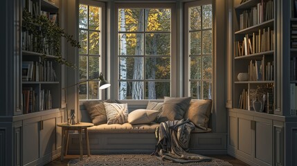 A cozy reading nook with a bay window seat