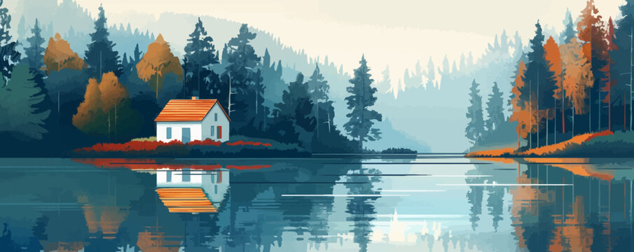 A tranquil riverside retreat with cozy cottages nestled among towering trees. Vector flat minimalistic isolated illustration