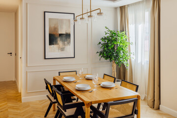 Stylish interior of living room with fireplace decorated Christmas tree. Christmas decoration.
