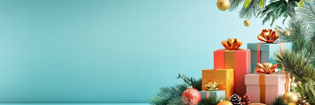 Holiday gift banner for online shopping featuring colorful presents and festive decorations